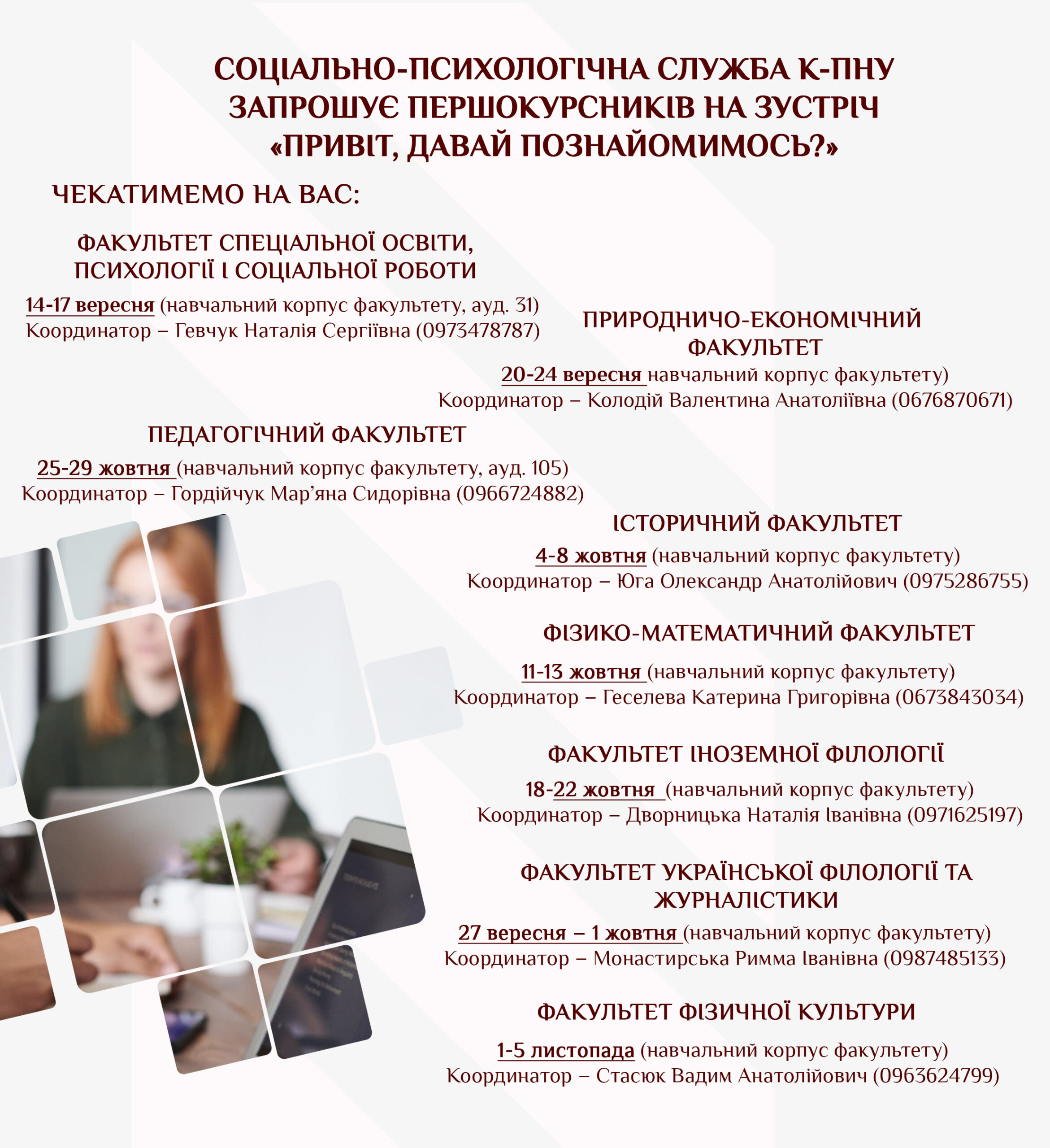 Від За замовчуванням для сайтуОприлюднено Опубліковано в Новини Соціально-психологічна служба К-ПНУ запрошує студентів першого курсу на зустріч-знайомство. Навігація записів Із Днем знань!Настановча сесія