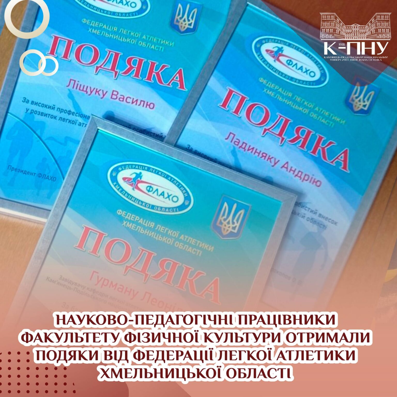 14 січня відбулася звітно-виборча конференція Федерації легкої атлетики Хмельницької області. Президент Федерації легкої атлетики Хмельницької області Олександр Прокопов висловив подяки за високий професіоналізм і вагомий особистий внесок у розвиток легкої атлетики Хмельницької області науково-педагогічним працівникам факультету фізичної культури К-ПНУ, а саме: завідувачу кафедри легкої атлетики, заслуженому тренеру України Леоніду Гурману, доценту кафедри легкої атлетики, заслуженому тренеру України Василю Ліщуку та викладачу кафедру легкої атлетики Андрію Ладиняку.