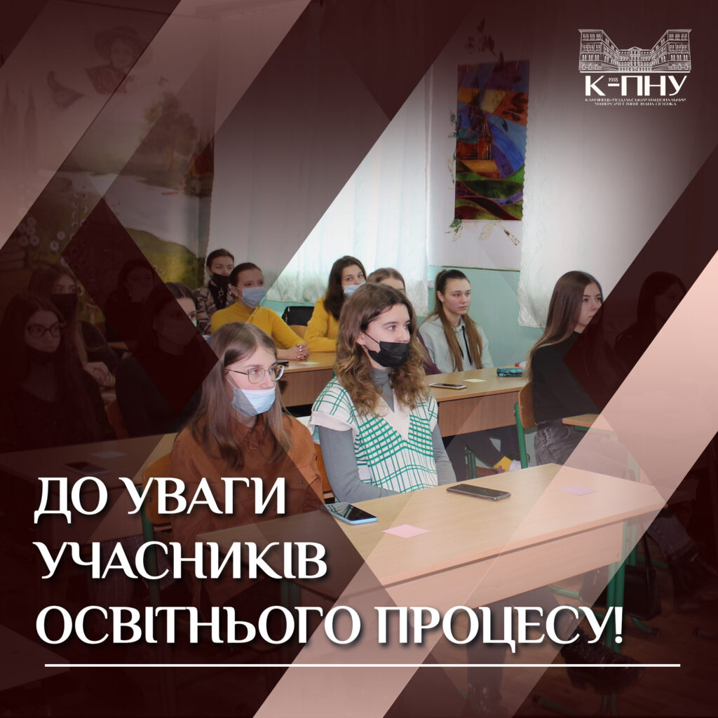 У зв’язку з погіршенням епідеміологічної ситуації в Україні, спричиненої поширенням респіраторної хвороби COVID-19, та стрімким поширенням коронавірусної хвороби (штаму «Омікрон»), з 07 лютого до 25 лютого 2022 року освітній процес для здобувачів денної та заочної форм здобуття вищої освіти К-ПНУ буде відбуватися дистанційно.