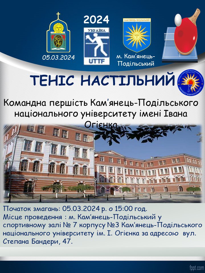05 березня відбудеться відкрита командна першість Кам’янець-Подільського національного університету з тенісу настільного.